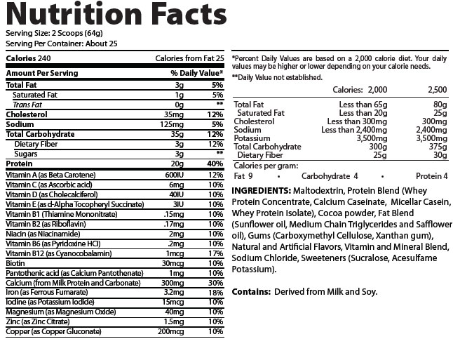 - For higher calorie intake: For pre-workout (30-45 min), add two (2) scoops (65g) of powder to at least one cup (8 oz.) of cold water or liquid of your choice. To maximize recovery after workouts or competition (within 45 min), use two (2) additional scoops (65g) post-workout.