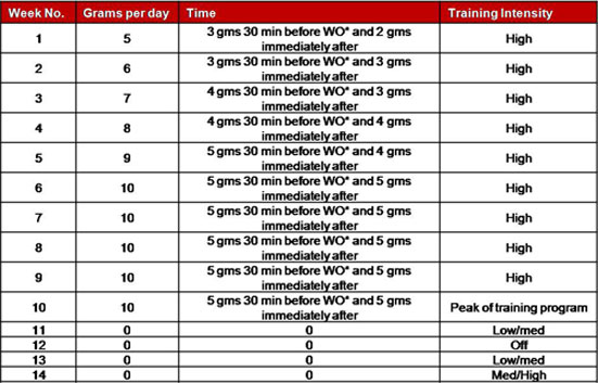 • From day 5 onward, ingest 5 grams (2.5 grams pre-exercise and 2.5 grams post-exercise) daily